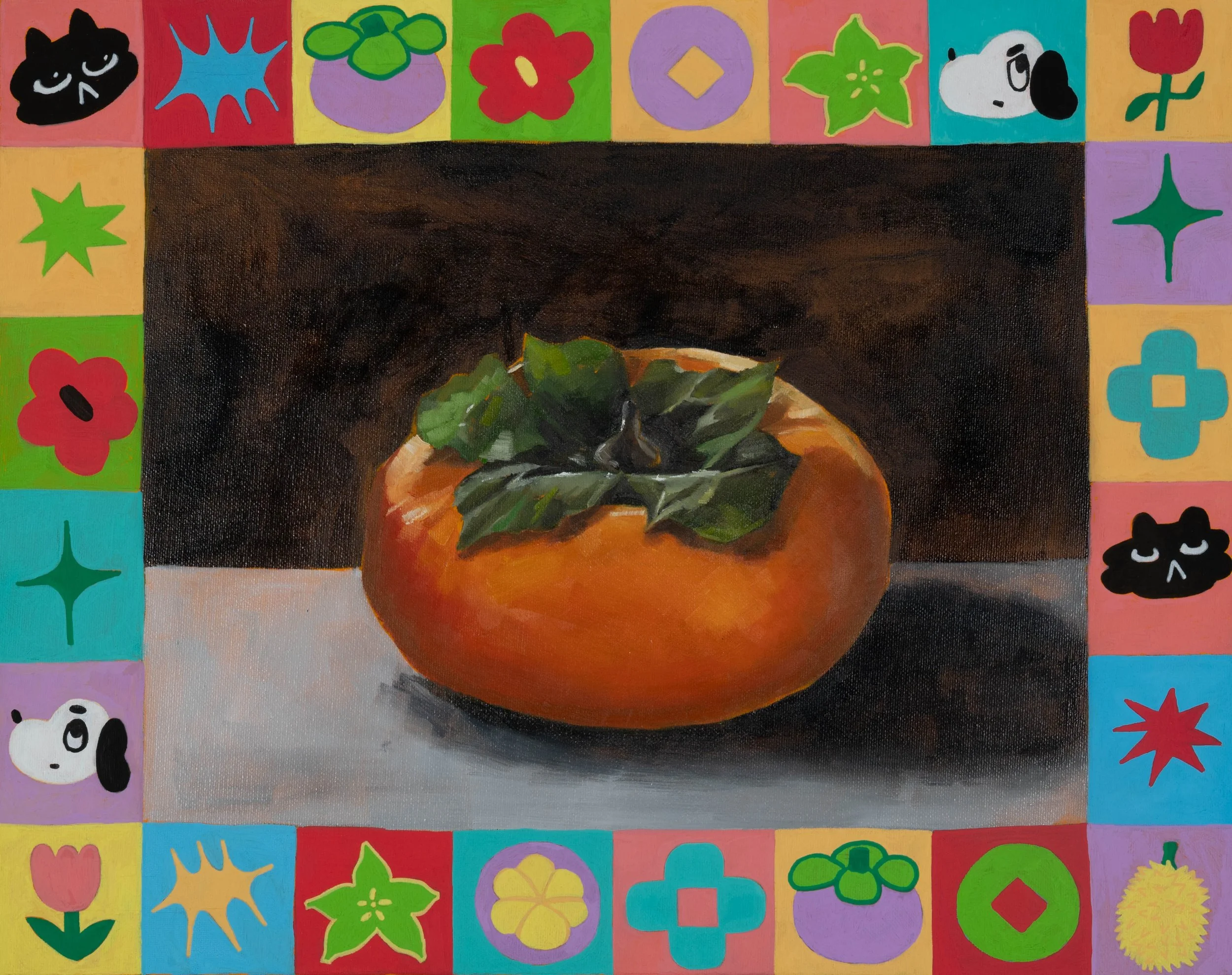 Persimmon, 2024, oil and acrylic paint and Posca Pens on canvas, 50cm x 39.7cm