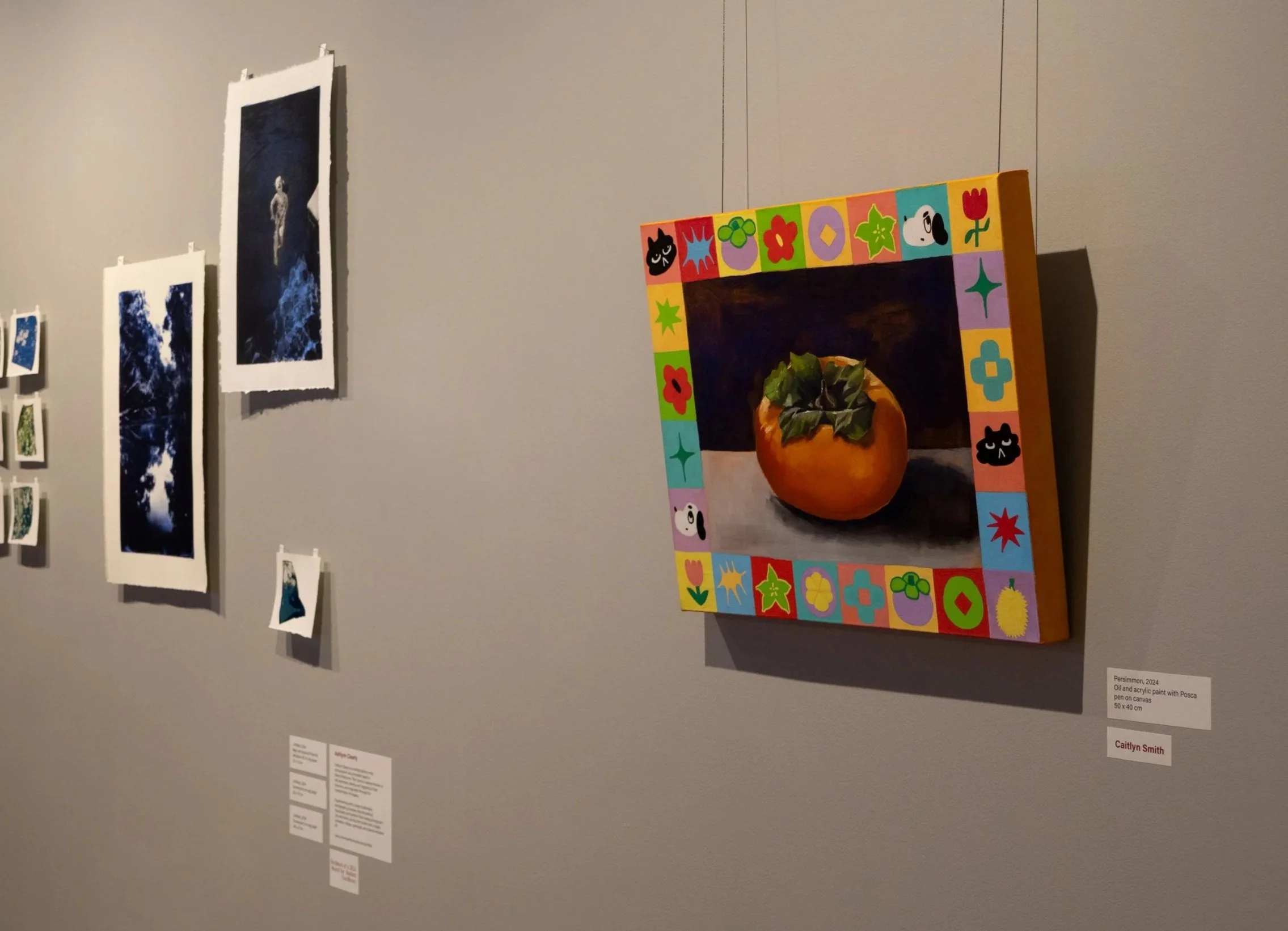 Persimmon is an appropriated painting of Edouard Manet’s The Melon. It tackles themes of cultural identity and heritage through replacing the fruit commonly seen in historical paintings with a Persimmon - one of many South East Asian tropical fruits. The choice of fruit was intentional, to subvert historical still life paintings. The colourful and playful border of the painting elaborates on this theme with recurring tropical fruits such as Mangosteen, Durian and Star Fruit. The border appropriates the thick traditional frame that the original painting was presented in at the NGV.